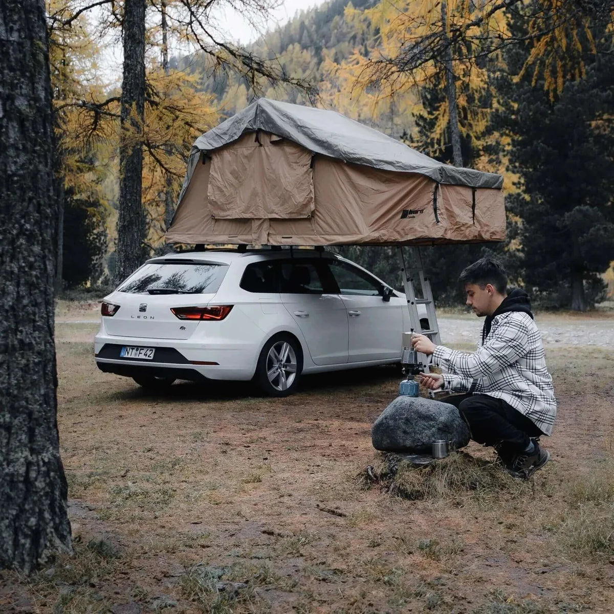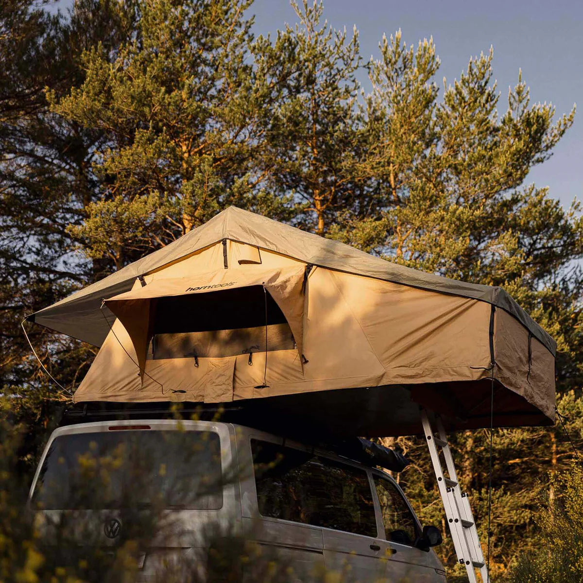 Das Dachzelt Desert besteht aus 280 G Segeltuch. Die Kombination von 65 % Polyester und 35 % Baumwolle sorgt für Atmungsaktivität und ein angenehmes Klima im Zelt. Dank des robusten Überdachs aus 210 D Polyester mit einer Wassersäule von 5000 mm und super isolierten Nähten, bist du effektiv vor Regen geschützt. Ein weiterer Vorteil bei schlechtem Wetter ist der trockene Einstieg von unten.