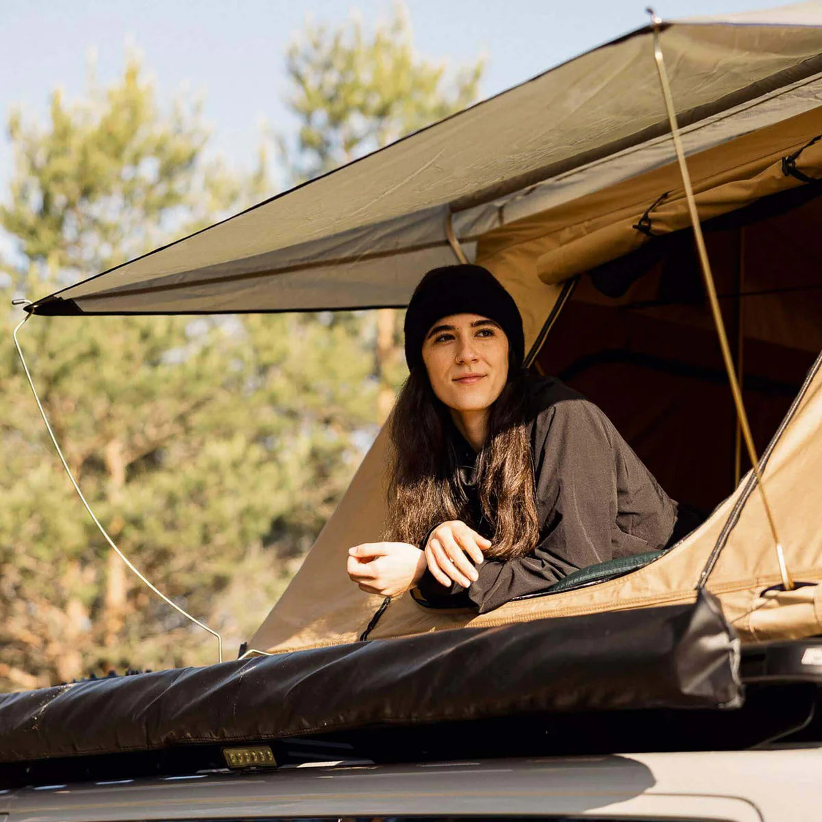 Das Vorzelt wird mit stabilen YKK-Reißverschlüssen am Dachzelt befestigt. Der Innenboden des großzügigen Vorzeltes ist wasserdicht und du kannst ihn herausnehmen, wenn du ihn nicht benötigst. Die Wände bewahren dich vor eisigem Nieselregen und Wind an kalten Tagen (der atmungsaktive Stoff des Vorzelts, ist im Gegensatz zum Dachzelt nicht komplett wasserdicht) und vor der brennenden Sonne im Sommer. Perfekt ist, dass du die Fenster bei Bedarf öffnen kannst, aber sie dann zusätzlich durch Moskitonetze geschützt sind.