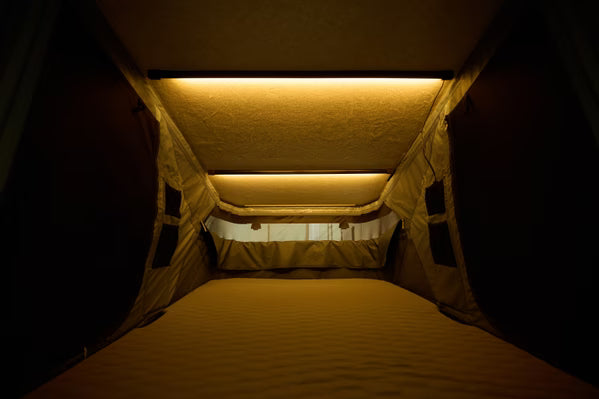 Innen findest du eine weiche, gesteppte Matratze, eine isolierte Filzdecke, dimmbare LED-Leuchten und vier Innentaschen. Die Leiter lässt sich an jeder Seite des Zelts befestigen und wird ordentlich in einer vielseitigen Leitertasche verstaut. Jedes Detail ist darauf ausgelegt, das Camping-Erlebnis zu verbessern.