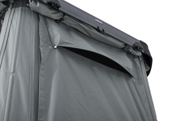 Die Matratze verwandelt sich in ein Sofa, sodass du bequem im Zelt sitzen und die Aussicht genießen, ein Buch lesen oder dem Regen beim Fallen zuschauen kannst. Mit der extra Höhe vorne, großen Panoramatüren und LED-Leuchten schafft das Thule Widesky einen einladenden, geräumigen Innenraum.