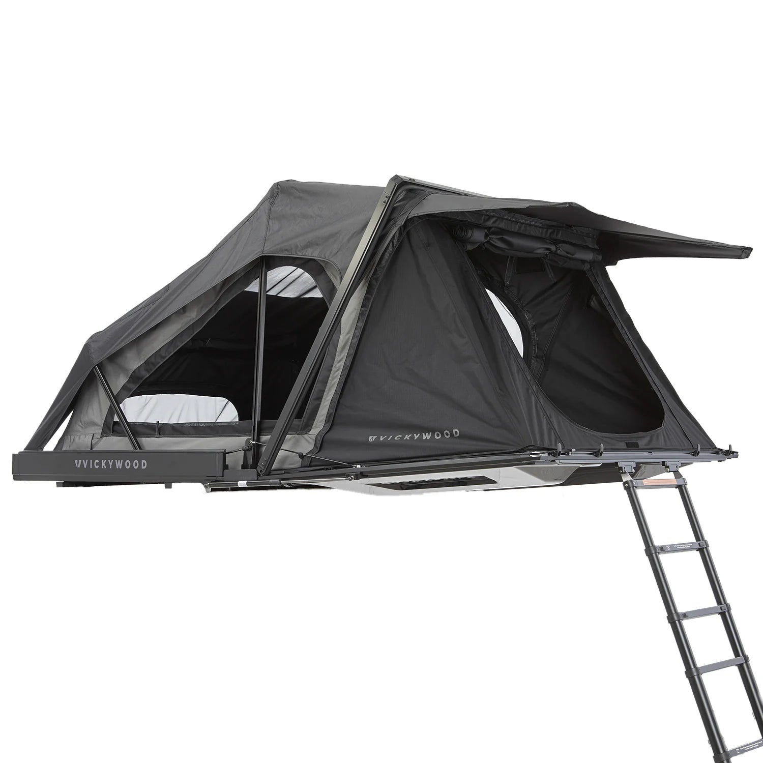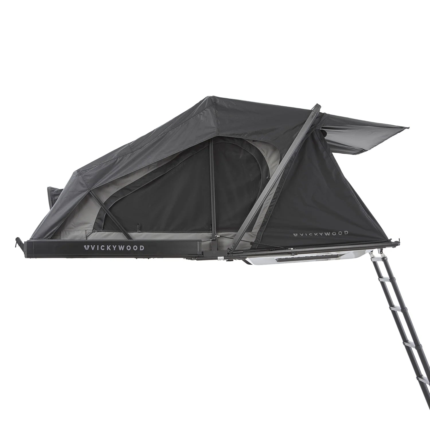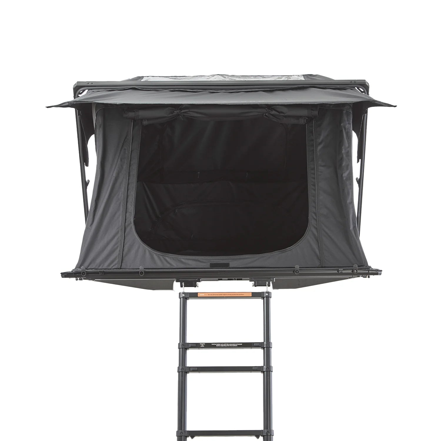Die erste fest montierte Leiter zum Einklicken. Du kannst die Leiter entriegeln und ausfahren während Du neben dem Auto stehst. Verwende sie, um das Zelt entspannt von dieser Position aus zu öffnen. Kein Klettern auf das Autodach notwendig. Während der Fahrt kann die Leiter auf dem Koffer verbleiben, wird links und rechts von aerodynamischen Formteilen umschlossen und verursacht so kaum Windgeräusche. Alternativ lässt sie sich schnell demontieren – das reduziert das Dachzeltgewicht um weitere ca. 6 kg.