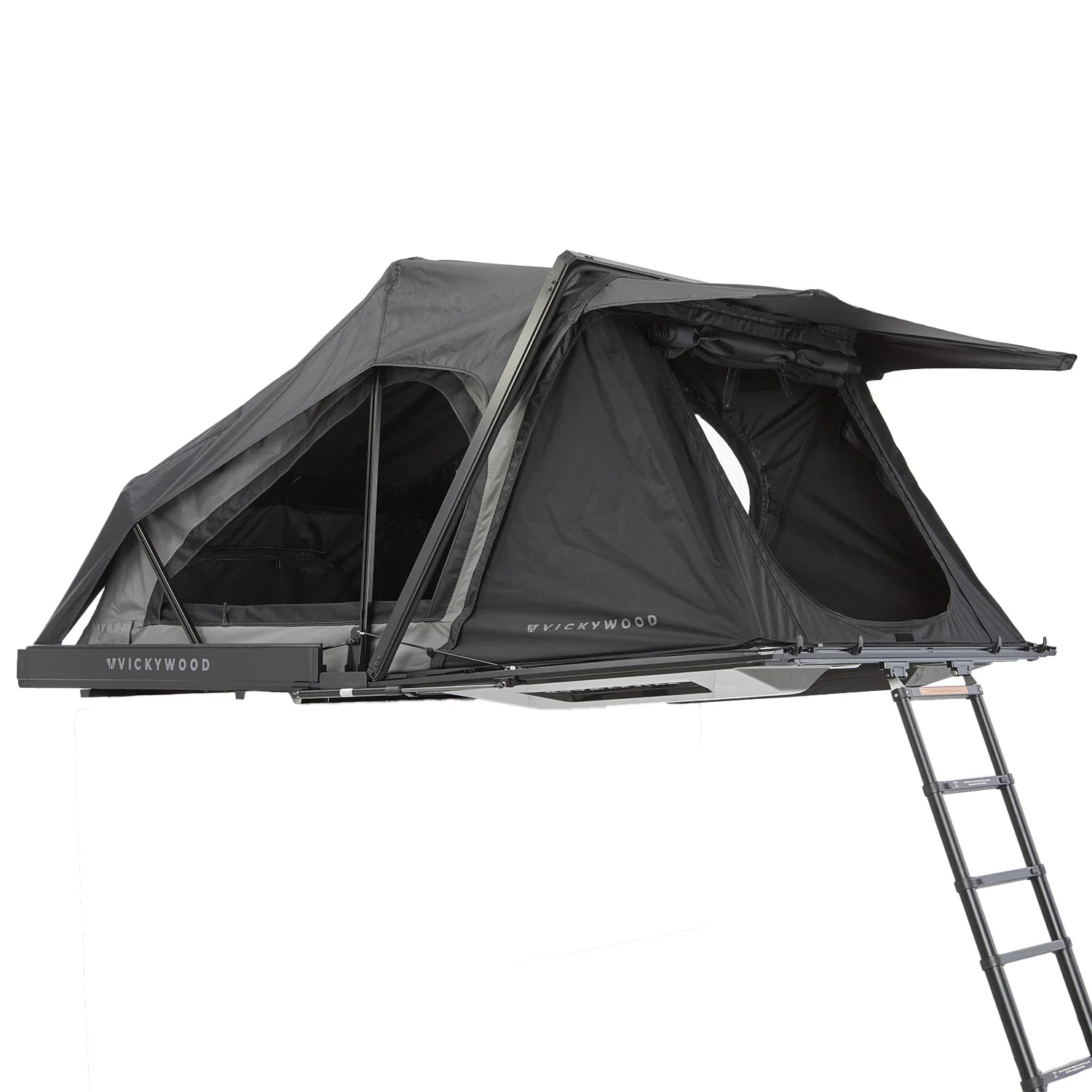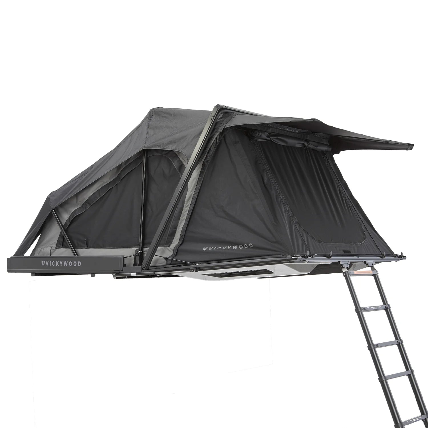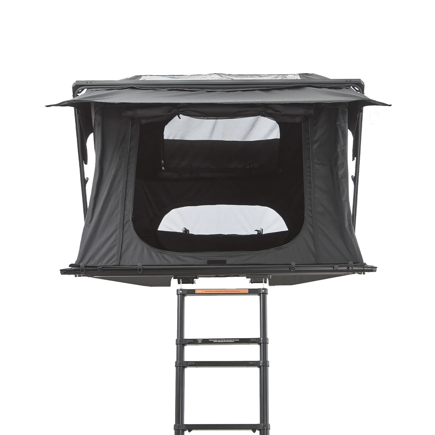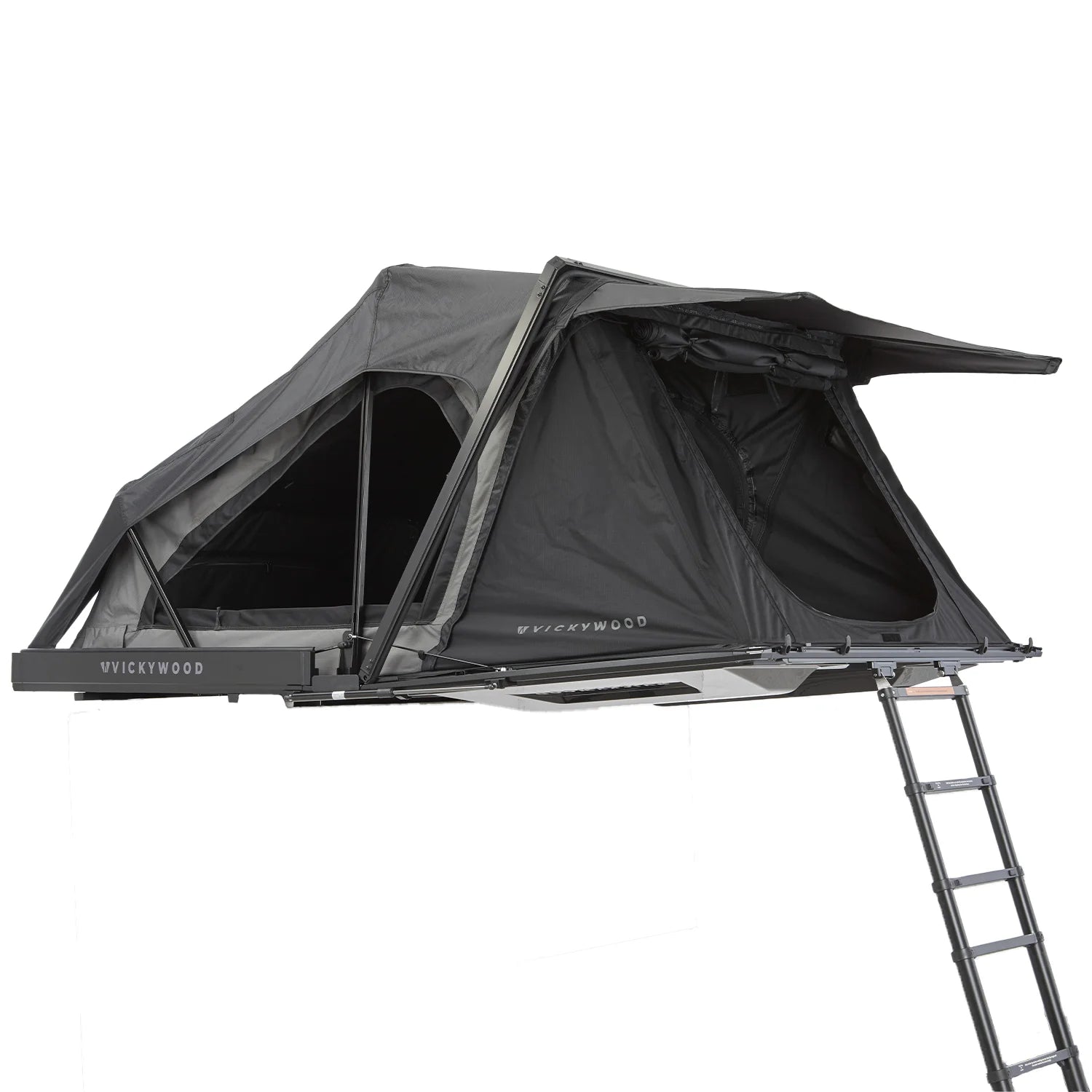 Die erste fest montierte Leiter zum Einklicken. Du kannst die Leiter entriegeln und ausfahren während Du neben dem Auto stehst. Verwende sie, um das Zelt entspannt von dieser Position aus zu öffnen. Kein Klettern auf das Autodach notwendig. Während der Fahrt kann die Leiter auf dem Koffer verbleiben, wird links und rechts von aerodynamischen Formteilen umschlossen und verursacht so kaum Windgeräusche. Alternativ lässt sie sich schnell demontieren – das reduziert das Dachzeltgewicht um weitere ca. 6 kg.