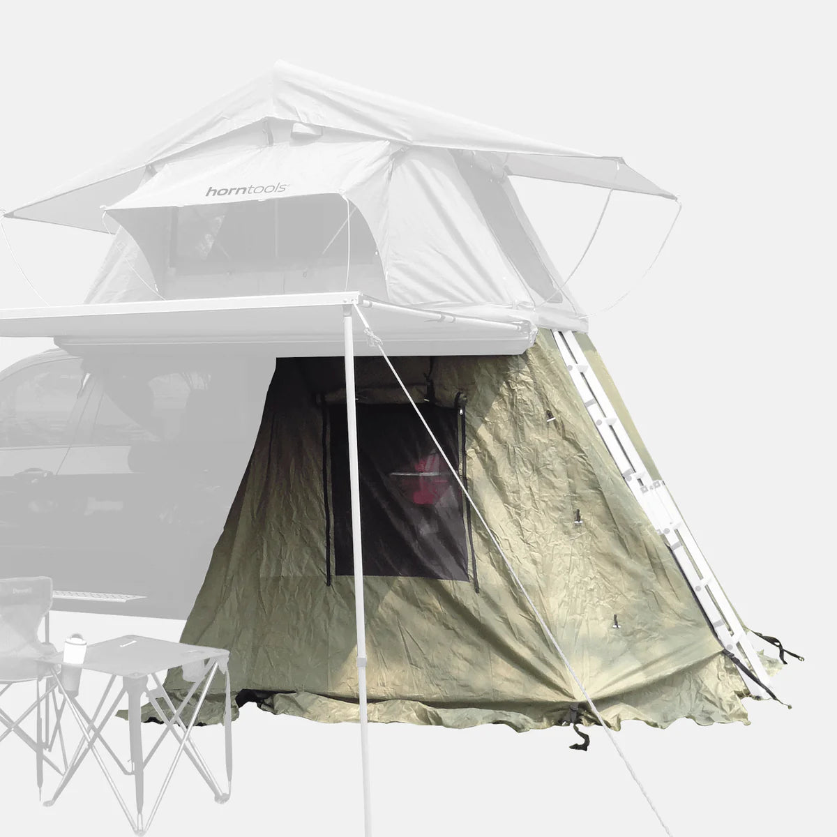 Das Vorzelt wird mittels Reißverschluss an deinem Trapper Joe Zelt befestigt. Rundum ist das Vorzelt mit Moskitonetzen ausgestattet.